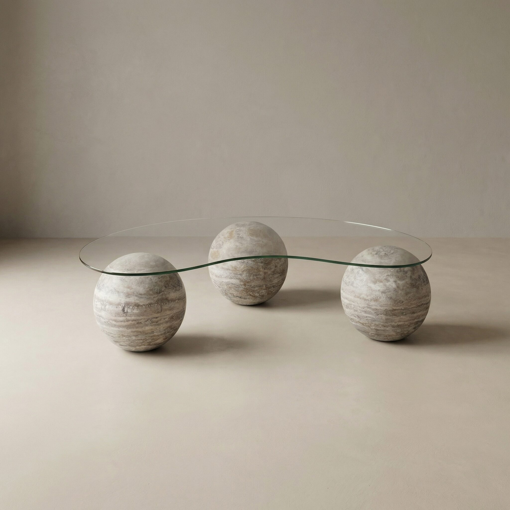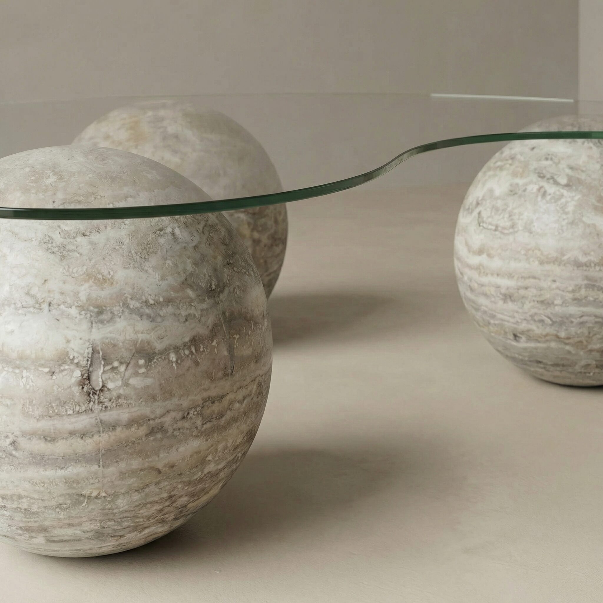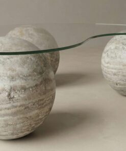 Mesa de Centro de Vidrio con Base Esférica de Travertino Silver