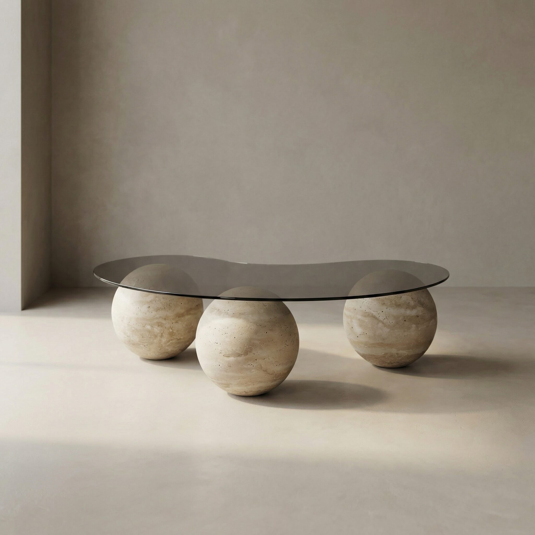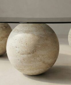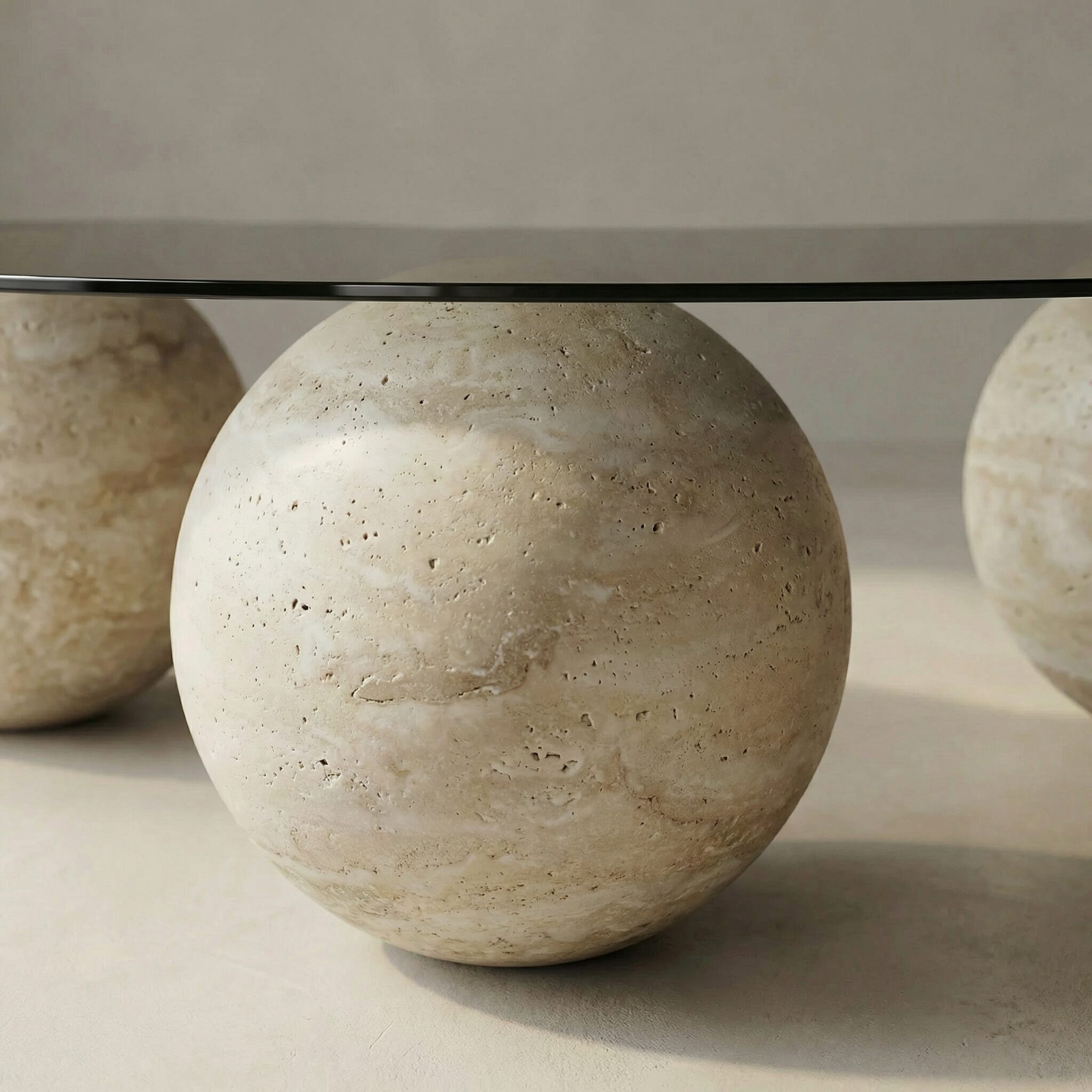 Table Basse en Verre avec Base Sphérique en Travertin Classique